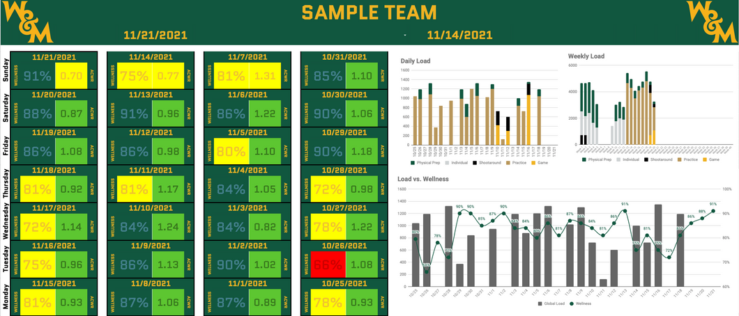 Monitor and manage your athletes on an individual basis with a more distilled dashboard for tracking their wellness and workloads. Includes visuals for the average Daily and Weekly Workloads, Wellness and Global Load from the last 28 days all the way up to the current day for that particular athlete- or shift the timeframe you want to see back further in time.