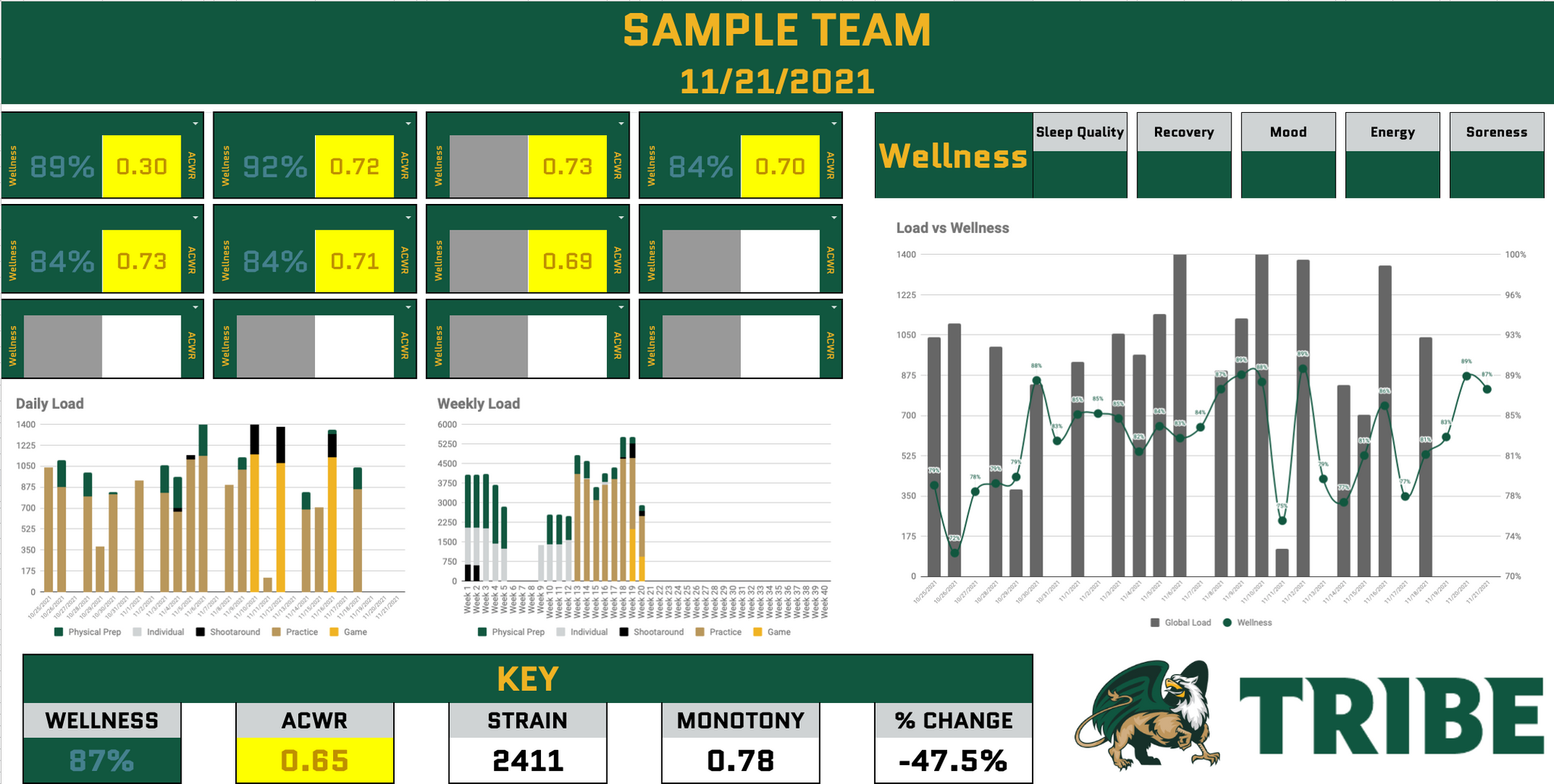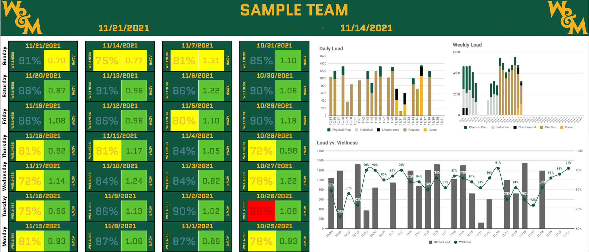 This monitoring dashboard assists in doing all of the above- providing simple, realtime information to your organization about the cost of preparing athletes for competition and how they are responding to paying that cost. Using sRPE and a Wellness Survey that incorporates a proprietary algorithm, this dashboard requires no more than 1-2 minutes per day of manual data entry to access metrics such as an Exponentially-Weighted Moving Average Acute-Chronic Workload Ratio (EWMA ACWR), training monotony, weekly percentage change, and a wellness score for all of your athletes, housed in a sleek, stoplight-coded interface that is readily digestible by all who have a hand on the athletes.